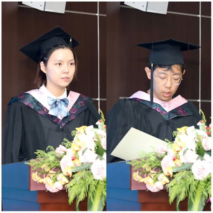 畢業生代表分別發表畢業感言,感謝學校和老師們的培養與辛勤付出,表示一定會帶著學校師長的期待與囑托,用好專業所學,為國家發展、社會進步貢獻自己的智慧與力量。