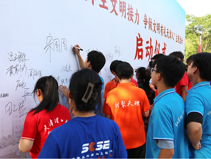 活動現(xiàn)場師生員工代表在“百萬師生文明接力 爭做文明有禮天津人”主題背景板簽名承諾并領(lǐng)取主題活動宣傳折頁。