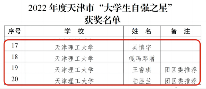近年來,學校在廣大天理青年中積極選樹典型,推報多名學子在“天津市大學生自強之星”“中國大學生自強之星”尋訪活動中獲得榮譽。下一步,校團委將全面貫徹落實黨的二十大精神,持續開展好青年榜樣典型選樹工作,引導天理青年爭做有理想、敢擔當、能吃苦、肯奮斗的新時代好青年,讓青春在全面建設社會主義現代化國家的火熱實踐中綻放絢麗之花。
