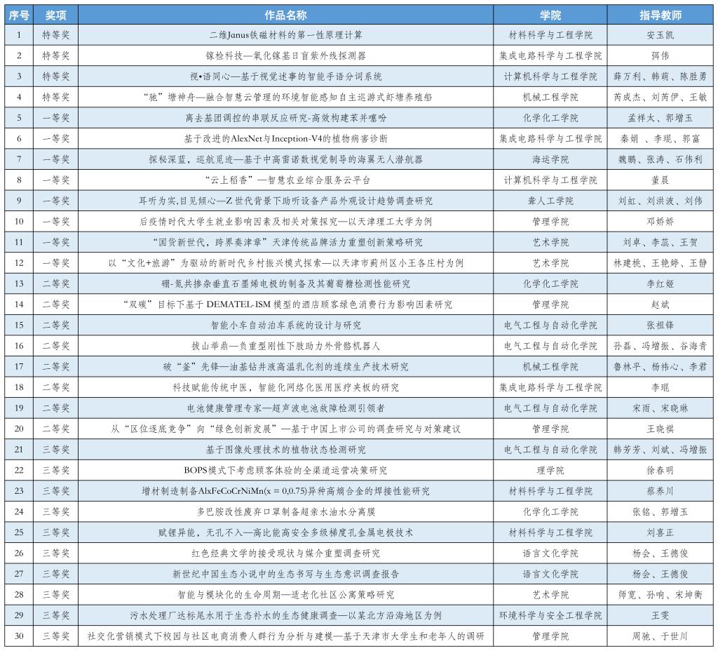 5月26日至27日,第十七屆“挑戰(zhàn)杯”天津市大學(xué)生課外學(xué)術(shù)科技作品競賽終審決賽答辯在天津工業(yè)大學(xué)舉行。我校共有30項作品獲獎,其中特等獎4項、一等獎8項、二等獎8項、三等獎10項。4項特等獎作品全部被推薦參加“挑戰(zhàn)杯”國賽。本屆競賽我校學(xué)生作品的獲獎總數(shù)、各等級獲獎數(shù)、進入國賽項目數(shù)均取得優(yōu)異成績。