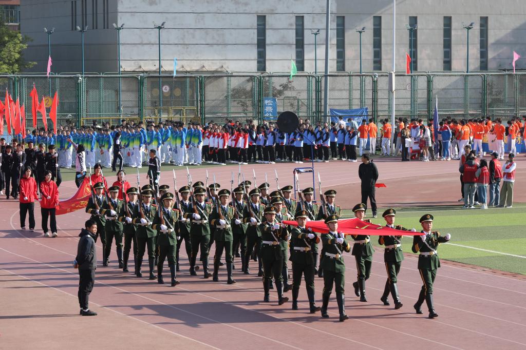 在雄壯的樂曲聲中,19個單位的學生和教師方隊身著統一服裝,精神抖擻、步伐矯健、口號響亮,依次通過主席臺,接受檢閱,展現出昂揚向上、奮勇爭先的精神風貌,贏得了在場師生的陣陣掌聲。