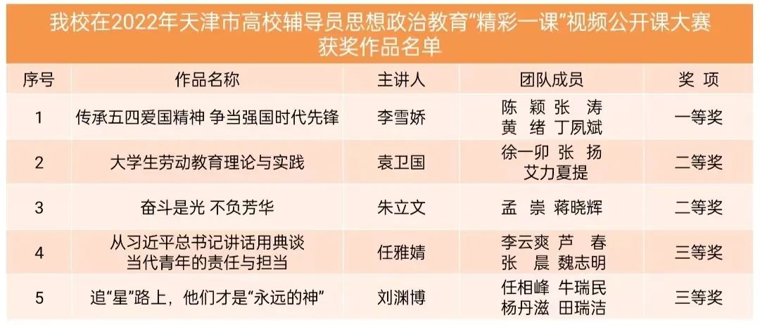 為學習宣傳貫徹習近平新時代中國特色社會主義思想,落實立德樹人根本任務,著力提升思想政治教育的實效性、針對性和親和力,引導廣大學生深刻體會“兩個確立”的決定性意義,深化愛黨愛國愛人民愛社會主義教育,市委教育工委 市教委舉辦了2022年天津市高校輔導員思想政治教育“精彩一課”視頻公開課大賽,我校積極組織、精心準備,經過專家評委評審,我校在此次大賽中被評為“優秀組織單位”,榮獲一等獎1項,二等獎2項,三等獎2項。