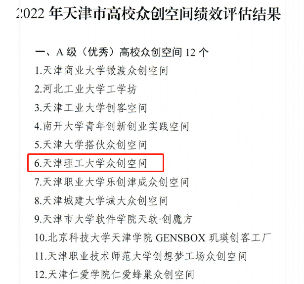 近日,市教委公布2022年天津市高校眾創空間績效評估結果,經評估數據上報、數據核查、負責人答辯、專家評審、市教育兩委審核及公示等環節,天津理工大學眾創空間再次獲評天津市A級(優秀)高校眾創空間,這已是我校連續第七年獲此殊榮。