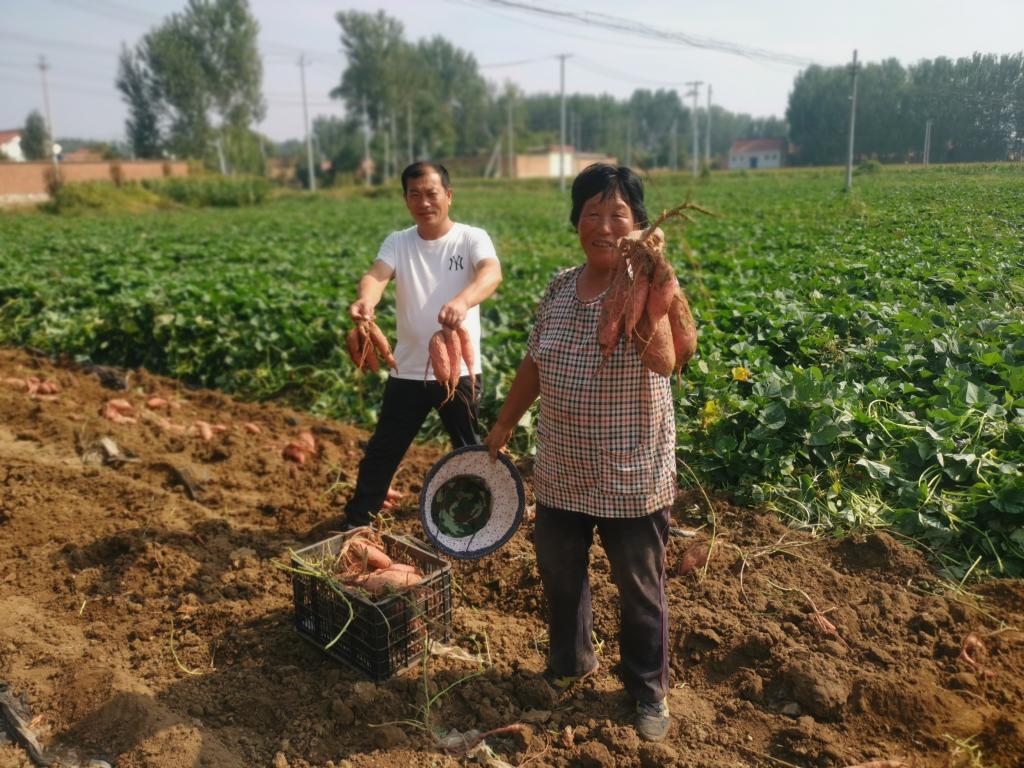 駐村工作隊攜村“兩委”班子成員多次赴周邊進行實地考察農業項目,先后聯絡20余家農業企業到村進行指導,最終確定蜜薯、辣椒種植項目,聯合村集體提出“種植1+1+1”模式,于2022年初以村集體公司牽頭,率先在大王務村和利民村流轉土地65畝,作為蜜薯和辣椒種植試驗田,與專業育苗種植公司對接。目前,試驗田迎來豐收,蜜薯個頭勻稱,粉紅飽滿,畝產可達6000斤,經濟效益可達70余萬元。駐村工作隊為蜜薯申請“食色金鮮”商標品牌,發揮品牌效應,促進集體和農民增收。拓寬渠道,與合作銷售團隊開辟銷售網點,聯合鎮政府與專業直播團隊開設網上直播銷售平臺,并在學校申請開設專門銷售點位,首日800余箱蜜薯銷售一空。