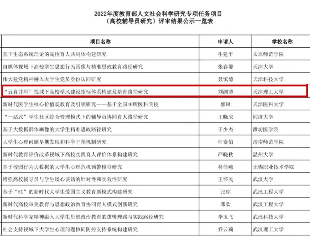 近日,教育部社科司發布了2022年度教育部人文社會科學研究專項任務項目(高校輔導員研究)評審結果。本次評審自年初開始啟動申報工作,經專家評審,全國最終確定高校輔導員研究項目入選208項。我校計算機科學與工程學院輔導員劉淵博主持申報的《“五育并舉”視域下高校學風建設指標體系構建及培育路徑研究》獲批立項。