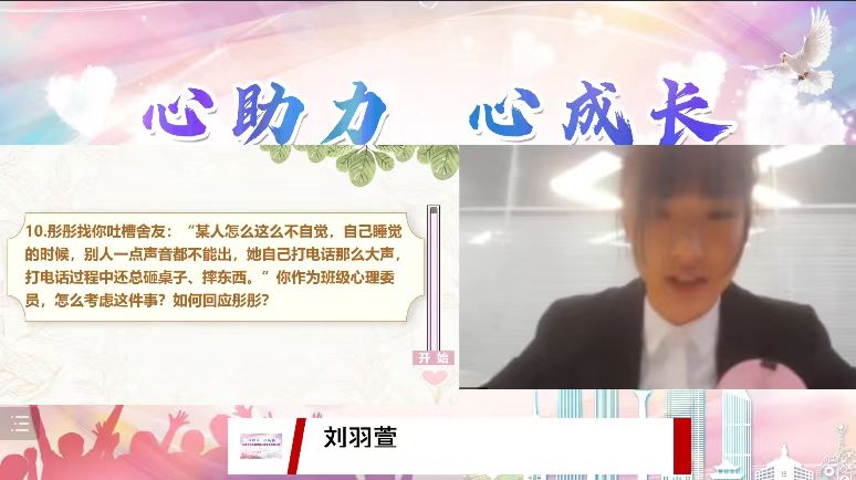 決賽全程為線上開展,評委評分采取線上評分。決賽由一見傾心(VCR展示)、心領(lǐng)神會(心理科普)、平心而論(案例分析)三部分組成。在決賽中,劉羽萱同學(xué)知識儲備豐富、技能運用嫻熟、現(xiàn)場發(fā)揮精彩,最終從10位決賽選手中脫穎而出,獲得大賽二等獎。