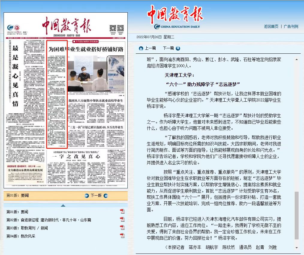 據(jù)悉,按照“重點(diǎn)關(guān)注、重點(diǎn)推薦、重點(diǎn)服務(wù)”的原則,學(xué)校針對(duì)就業(yè)困難畢業(yè)生在求職就業(yè)等方面存在的短板,制定“志遠(yuǎn)逐夢(mèng)”畢業(yè)生就業(yè)幫扶計(jì)劃實(shí)施方案,以幫助學(xué)生增強(qiáng)信心、提高綜合素質(zhì)和就業(yè)能力,首批“志遠(yuǎn)逐夢(mèng)”計(jì)劃36名受助學(xué)生均順利就業(yè)。2022年7月26日,《中國(guó)教育報(bào)》在頭版對(duì)學(xué)校創(chuàng)新模式,實(shí)現(xiàn)精準(zhǔn)就業(yè)幫扶的經(jīng)驗(yàn)做法進(jìn)行關(guān)注報(bào)道,隨后得到中華人民共和國(guó)教育部官方網(wǎng)站轉(zhuǎn)載。