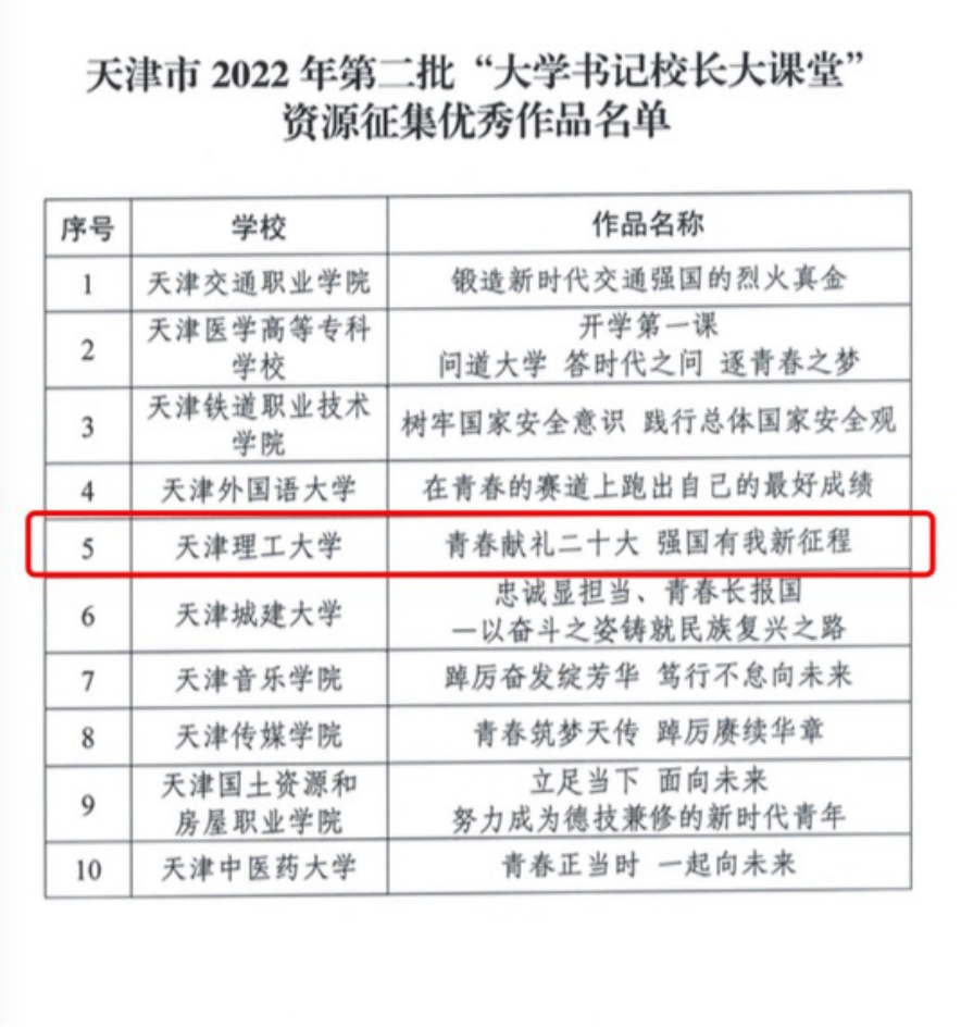 據悉,為深入貫徹習近平總書記關于教育的重要論述,全面落實立德樹人根本任務,推進高等教育高質量發展,天津市根據教育部相關工作安排,在首批資源征集的基礎上開展了第二批“大學書記校長大課堂”資源征集工作。市教育兩委委托天津市學校愛國主義教育聯盟(南開大學)邀請相關專家對作品進行評審,遵循公平、公正、公開的原則,共有10份作品獲評優秀,并推薦參加教育部征集工作。