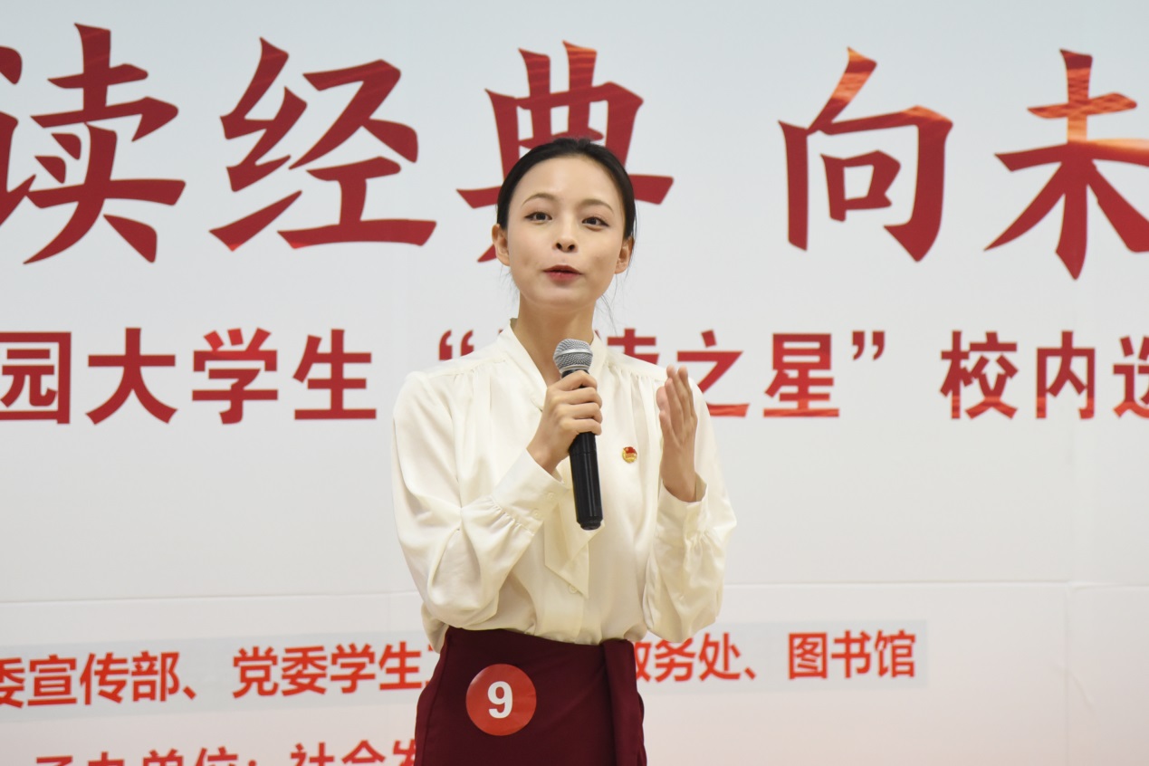 經過各學院推薦選拔,16名同學角逐本次選拔賽。比賽中,有的選手分享《國家相冊——改革開放四十年的家國記憶》的讀書感悟,以小故事講述大歷史,以小細節呈現大時代,帶領在場觀眾共同感受改革開放四十多年中國翻天覆地的變化;有的選手分享《王安石傳》《青春之歌》等書籍的閱讀心得。一句句感人肺腑的話語,一段段暖人心脾的故事,深深感染著在場的每一位觀眾。整場比賽高潮迭起、精彩紛呈,贏得陣陣掌聲。最終,管理學院2021級本科生楊賀新分享的《重溫時代記憶,共創盛世中華》榮獲一等獎并將代表學校參加市級決賽。