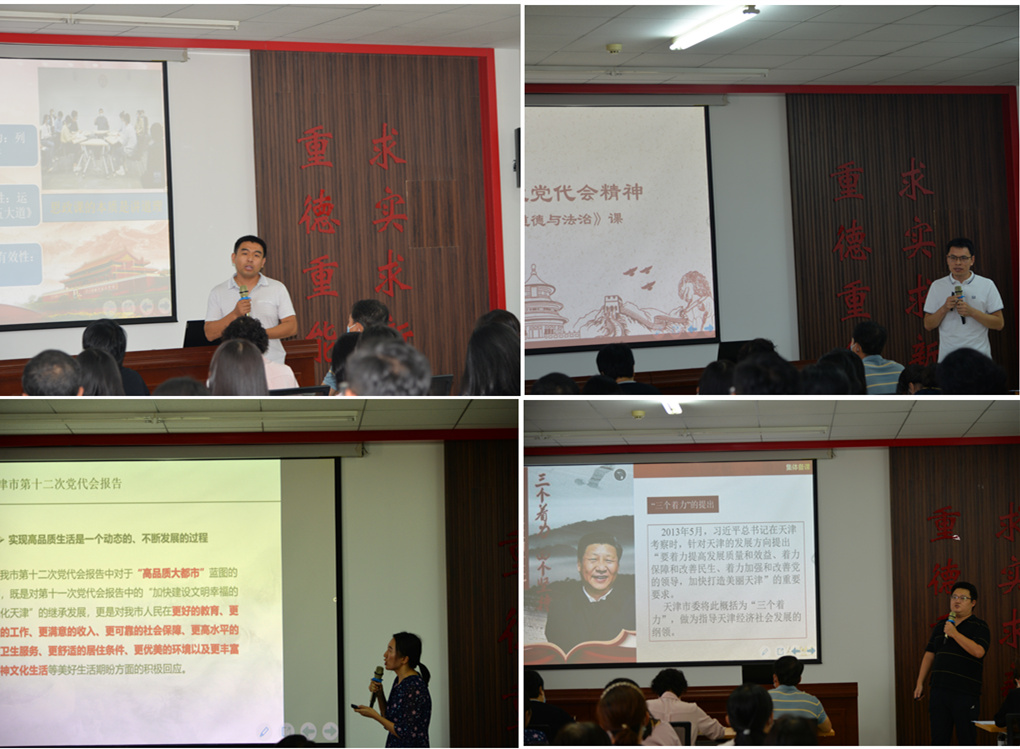 在分享展示環(huán)節(jié),綱要教研室王俊橋、德法教研室高俊龍、原理教研室孫寧、形策教研室張磊、概論教研室晉利珍分別作題為“天津歷史文化資源融入綱要課教學(xué)的若干思考”“天津市第十二次黨代會精神融入德法課”“唯物史觀視角解讀天津市第十二次黨代會精神”“立足‘三個著力’重要要求,淺析市第十二次黨代會精神融入思政課時的案例選擇”“善用‘大思政課’,講好美麗天津的故事——黨的十八大以來美麗天津建設(shè)的歷史性成就”的主題分享,幾位老師從不同角度和維度展示將黨代會精神融入思政課教學(xué)的路徑。