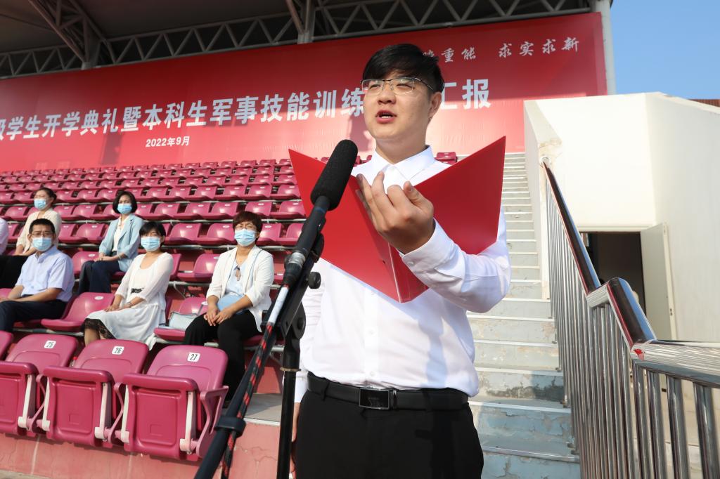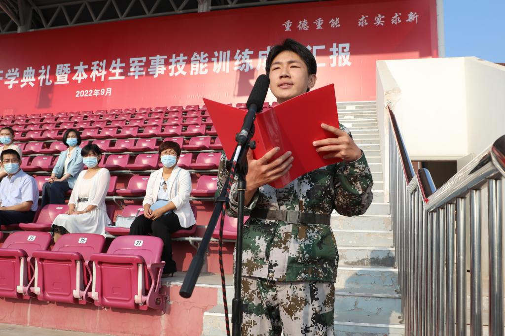 校黨委書記劉東志發(fā)表了熱情洋溢的講話,他充分肯定了參訓(xùn)人員的訓(xùn)練成果,高度評價了本次軍事技能訓(xùn)練的育人效果。他寄語同學(xué)們堅守報國丹心,樹立鴻鵠之志,涵養(yǎng)浩然正氣;希望全體新生以軍訓(xùn)為起點,“向英雄學(xué)習(xí)、向前輩學(xué)習(xí)、向榜樣學(xué)習(xí)”,心有大我,把愛國之情、報國之志融入祖國改革發(fā)展的偉大事業(yè)之中、融入人民創(chuàng)造歷史的偉大奮斗之中;要“重整行裝再出發(fā)”,以“咬定青山不放松”的堅韌和“直掛云帆濟(jì)滄海”的豪情開啟新學(xué)期,堅持“德能為本、實新為范”,不斷豐富知識儲備,強(qiáng)化實踐能力,努力做到德智體美勞全面發(fā)展,做無愧于祖國、無愧于時代的天理青年,以實際行動和優(yōu)異成績迎接黨的二十大勝利召開。