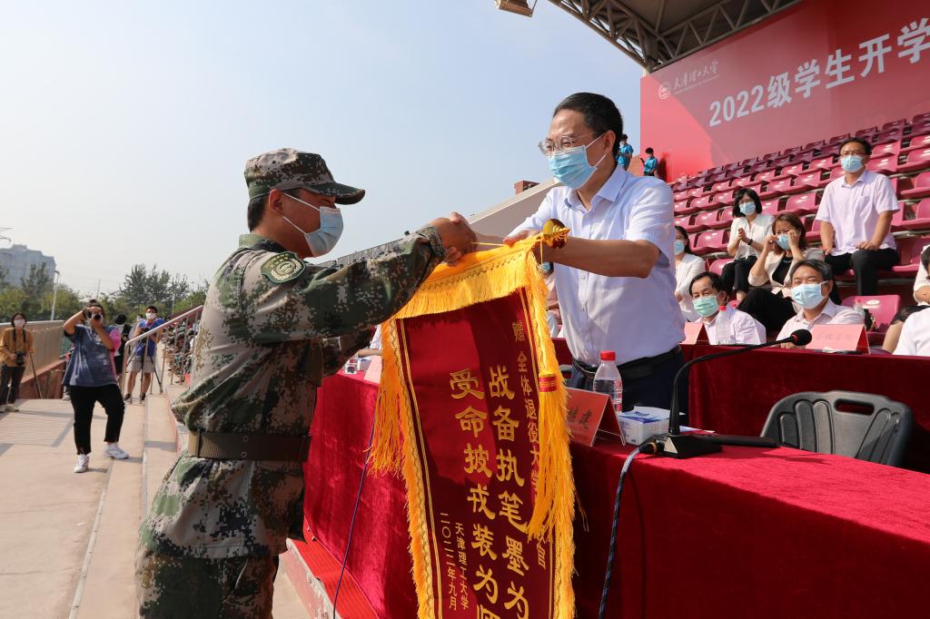 校長練繼建向獲得本次軍訓(xùn)特殊貢獻(xiàn)獎的在校退役大學(xué)生教練員集體贈送錦旗。