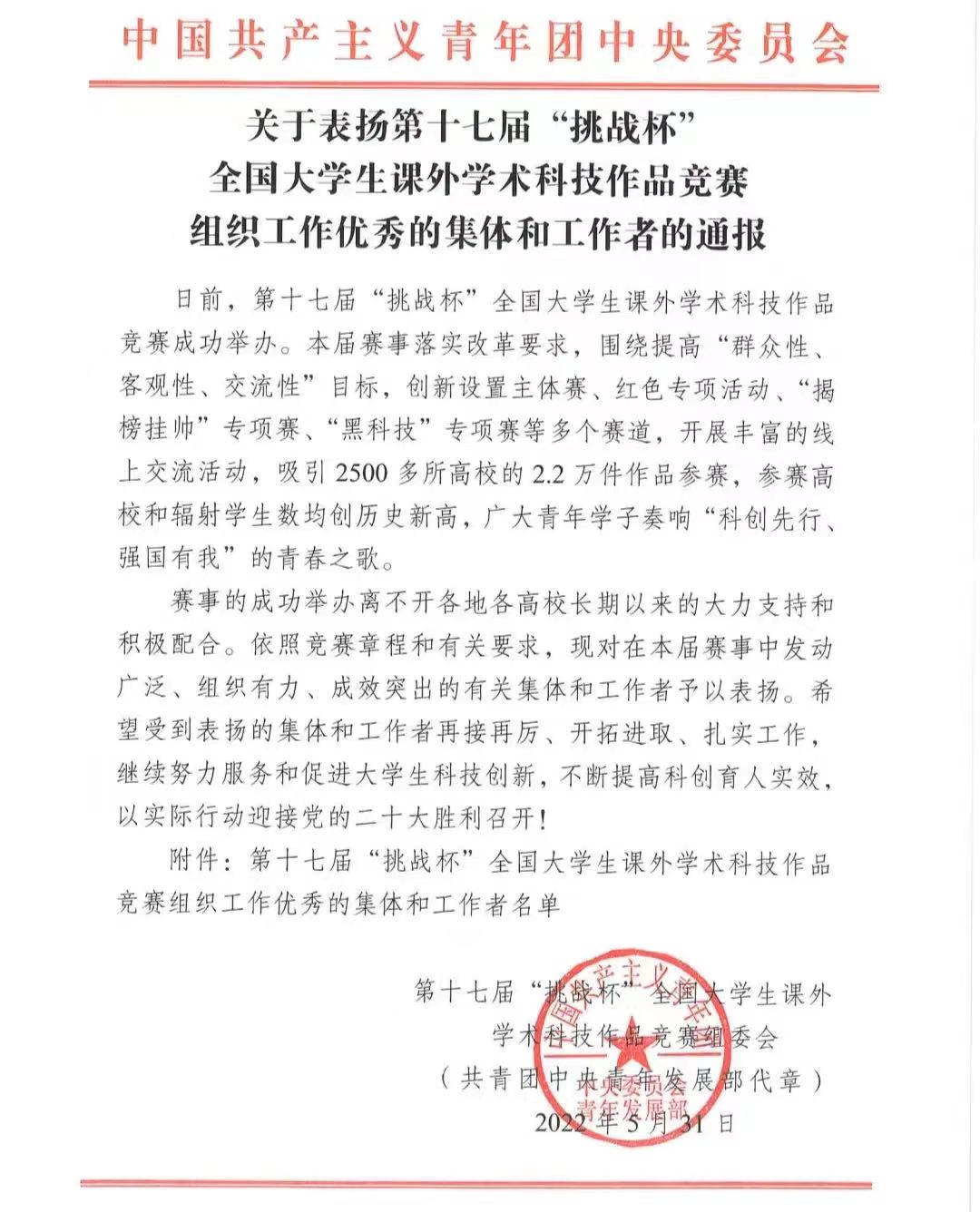 第十七屆“挑戰杯”全國大學生課外學術科技作品競賽圍繞提高“群眾性、客觀性、交流性”的目標,創新設置主體賽、紅色專項活動、“揭榜掛帥”專項賽、“黑科技”專項賽等多個賽道,全國2500多所高校2.2萬件作品參賽。本屆競賽中,我校榮獲全國特等獎1項、二等獎1項;“揭榜掛帥”專項賽全國特等獎1項、二等獎2項、三等獎1項;紅色專項活動全國三等獎1項,實現了在“挑戰杯”全國大賽多個類別競賽中獲獎數量和等級的新突破。