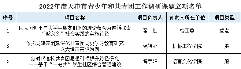 為深入學習貫徹習近平新時代中國特色社會主義思想,貫徹落實習近平總書記關于青年工作的重要思想,團市委開展2022年度天津市青少年和共青團工作調研成果征集。經資格審核、專家評審,我校在2022年度天津理工大學共青團和青年工作調研課題中擇優推薦8個項目參加評選。近日,團市委公布調研課題立項名單,全市共獲批調研課題27項,其中重點課題7項,一般課題20項,我校共有3個項目獲批立項,其中重點課題1項,一般課題2項。