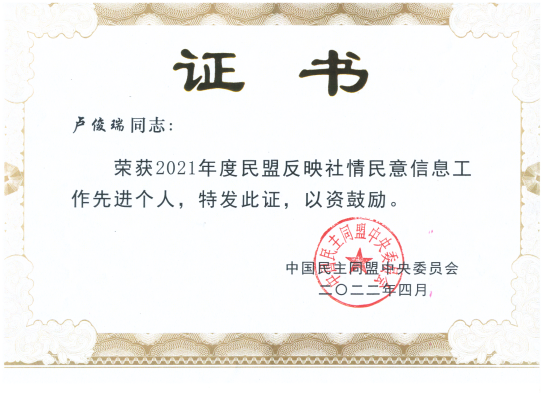 為表彰先進(jìn)推廣經(jīng)驗(yàn),著力提升民盟參政議政能力和水平,更好地履行參政黨職能,努力做中國(guó)共產(chǎn)黨的好參謀、好幫手、好同事,民盟中央對(duì)在2021年度參政議政工作中作出突出貢獻(xiàn)的先進(jìn)單位和先進(jìn)個(gè)人予以表彰。我校盧俊瑞同志榮獲“民盟反映社情民意信息工作先進(jìn)個(gè)人”稱號(hào)。