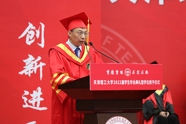 畢業(yè)典禮在莊嚴(yán)的國歌聲中拉開帷幕。黨委常委、副校長陳勝勇宣讀“天津理工大學(xué)學(xué)位評定委員會關(guān)于授予博士、碩士學(xué)位的決定”。黨委常委、副校長張繼東宣讀“天津理工大學(xué)學(xué)位評定委員會關(guān)于授予學(xué)士學(xué)位的決定”。黨委副書記杜長有宣讀《2022屆天津理工大學(xué)本科優(yōu)秀畢業(yè)生表彰決定》,號召全體畢業(yè)生向他們學(xué)習(xí),爭做堪當(dāng)民族復(fù)興重任的時(shí)代新人,在新的青春賽道上踔厲奮發(fā)、勇毅前進(jìn)。