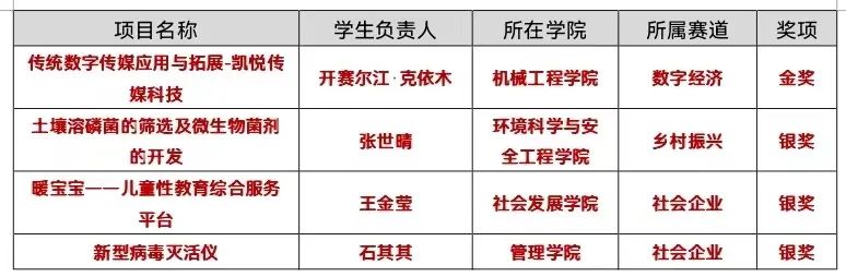 自競賽開始以來,學校廣泛宣傳和組織動員,學生團隊踴躍報名參賽,經過評委線上評審、選手線上路演答辯等環節,機械工程學院2018級本科生開賽爾江·克依木項目團隊的作品《傳統數字傳媒應用與拓展-凱悅傳媒科技》獲得金獎并入圍國賽。環境科學與安全工程學院2020級本科生張世晴項目團隊作品《土壤溶磷菌的篩選及微生物菌劑的開發》,社會發展學院2020級本科生王金瑩項目團隊作品《暖寶寶——兒童性教育綜合服務平臺》,管理學院2020級本科生石其其項目團隊作品《新型病毒滅活儀》獲得銀獎。