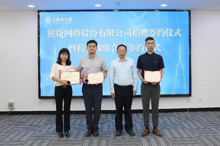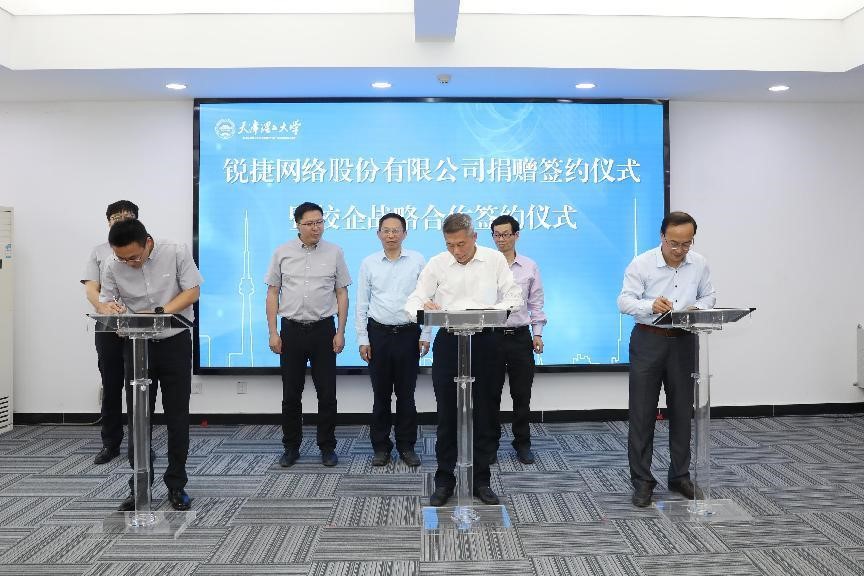 5月19日下午,銳捷網絡股份有限公司向天津理工大學捐贈簽約儀式暨校企戰略合作簽約儀式在我校舉辦。銳捷網絡股份有限公司副總裁兼北區總經理馬雪峰,全國高教行業總經理黃鎮,全國高教行業副總經理李棟,身份管理事業部副總經理關天,智慧教室事業部副總經理徐云彪,天津區域總經理賈斌,以及聯合捐贈企業皖通科技天津研發中心、四川湖山電器股份有限公司天津分公司負責人出席儀式。校黨委副書記、校長練繼建,黨委副書記杜長有,副校長陳勝勇,校友會、學校國有資產及校園經濟管理處、校黨委學工部、網絡安全和信息化辦公室、教務處、檔案館、計算機科學與工程學院、發展戰略研究中心負責人出席儀式。