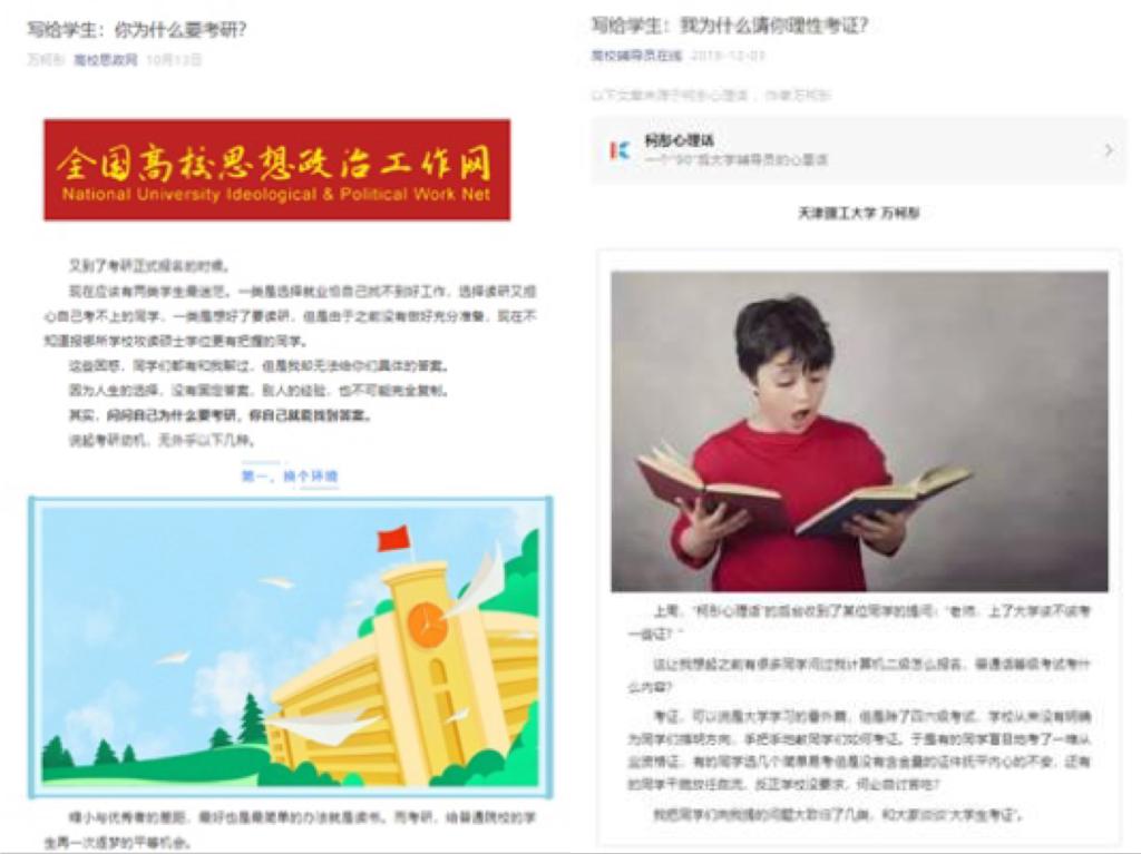 “柯彤心理話”系列新媒體平臺(tái)(微信公眾號(hào)、視頻號(hào)、抖音號(hào)、小紅書)原創(chuàng)百余篇《寫給學(xué)生》系列思政網(wǎng)文,瀏覽量數(shù)十萬;發(fā)布《大學(xué)生必讀》系列短視頻,用時(shí)代話語豐富思政教育的打開方式,與“00后”在互動(dòng)中凝聚共識(shí)。多篇網(wǎng)文先后被學(xué)習(xí)強(qiáng)國、高校思政網(wǎng)、教育部中國大學(xué)生在線、高校輔導(dǎo)員在線發(fā)布。媒體平臺(tái)負(fù)責(zé)人主持或參與委局級(jí)科研項(xiàng)目4項(xiàng),先后在《高校輔導(dǎo)員》等期刊雜志上發(fā)表多篇學(xué)術(shù)文章,在第五屆“全國高校網(wǎng)絡(luò)教育優(yōu)秀作品推選展示活動(dòng)”中獲得優(yōu)秀獎(jiǎng)。新冠肺炎疫情暴發(fā)初期,“柯彤心理話”第一時(shí)間正面發(fā)聲,多篇文章被高校思政網(wǎng)等平臺(tái)轉(zhuǎn)發(fā),受眾遍布全國各高校達(dá)數(shù)萬人。截至目前,“柯彤心理話”抖音粉絲2.4萬,獲贊34.2萬,微信視頻號(hào)累計(jì)播放量達(dá)10萬。