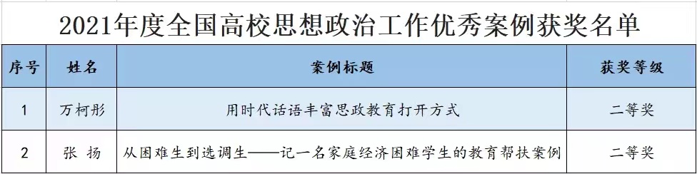2021年度全國高校思想政治工作優(yōu)秀案例征集活動(dòng)共收到各省(區(qū)、市)、各有關(guān)高校推薦案例626篇。經(jīng)資格審核、學(xué)術(shù)不端查詢,《高校輔導(dǎo)員》編輯部組織專家對(duì)符合評(píng)審條件的565篇案例進(jìn)行評(píng)審,共有381篇入選。其中,我校環(huán)境科學(xué)與安全工程學(xué)院萬柯彤撰寫的《用時(shí)代話語豐富思政教育打開方式》、管理學(xué)院張揚(yáng)撰寫的《從困難生到選調(diào)生——記一名家庭經(jīng)濟(jì)困難學(xué)生的教育幫扶案例》均榮獲2021年度全國高校思想政治工作優(yōu)秀案例二等獎(jiǎng)。