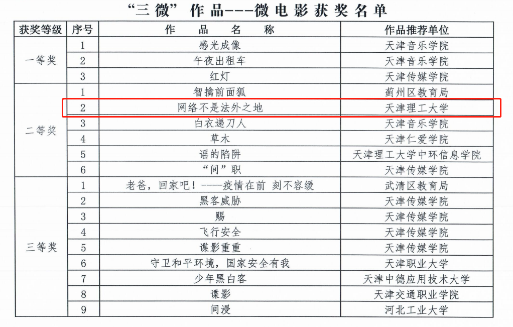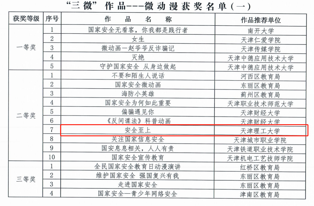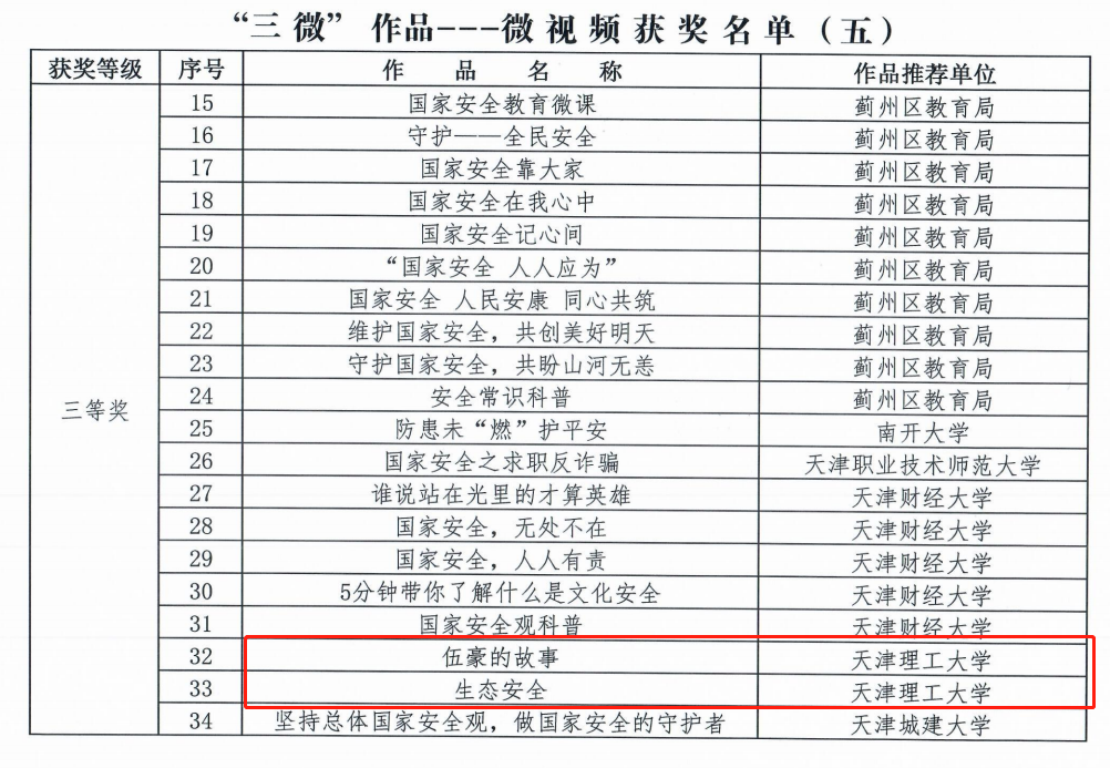 日前,市教育兩委下發《關于2022年教育系統國家安全宣傳教育活動“三微”作品獲獎的通知》(津教安函〔2022〕23號)。各參評單位緊密圍繞“樹牢總體國家安全觀,感悟新時代國家安全觀成就,為迎接黨的二十大勝利召開營造良好氛圍”主題,以著力推動大安全理念深入人心、落地生根,筑牢堅如磐石的首都政治“護城河”、 確保全市政治社會大局持續安全穩定,以優異的成績迎接黨的二十大勝利召開為主線,共報送“三微”作品300余部,參與人數達800余人。經過報送單位初評、專家復評,共評選出微電影優秀作品18部、微視頻優秀作品138部、微動漫優秀作品30部、優秀組織單位13家。我校師生創作的視頻作品獲得二等獎2個,獲得三等獎2個。