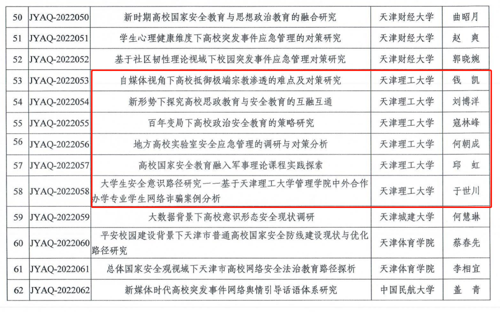 同時,我校申報2022年度國家安全宣傳教育重點調研課題9項,其中《自媒體視角下的高校抵御極端宗教滲透的難點及對策研究》《新形勢下探究高校思政教育與安全教育的互融互通》《百年變局下高校政治安全教育的策略研究》《地方高校實驗室安全應急管理的調研與對策分析》《高校國家安全教育融入軍事理論課程的實踐探索》《大學生安全意識路徑研究——基于天津理工大學管理學院中外合作辦學專業學生網絡詐騙案例分析》等6個項目獲批立項。