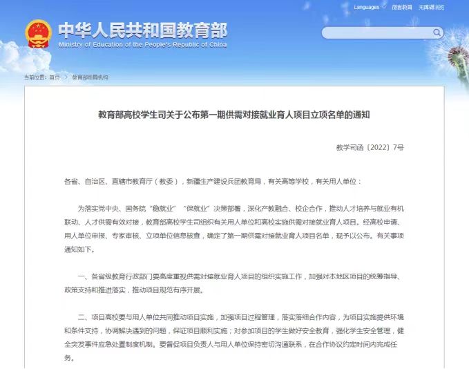 為落實(shí)黨中央、國(guó)務(wù)院“穩(wěn)就業(yè)”“保就業(yè)”決策部署,全面深化校企合作、推動(dòng)人才培養(yǎng)與就業(yè)有機(jī)聯(lián)動(dòng)、人才供需有效對(duì)接,促進(jìn)高校畢業(yè)生更加充分更高質(zhì)量就業(yè),教育部高校學(xué)生司組織有關(guān)用人單位和高校實(shí)施供需對(duì)接就業(yè)育人項(xiàng)目。經(jīng)高校申請(qǐng)、用人單位申報(bào)、專家審核、立項(xiàng)單位信息核查,確定第一期供需對(duì)接就業(yè)育人項(xiàng)目名單。