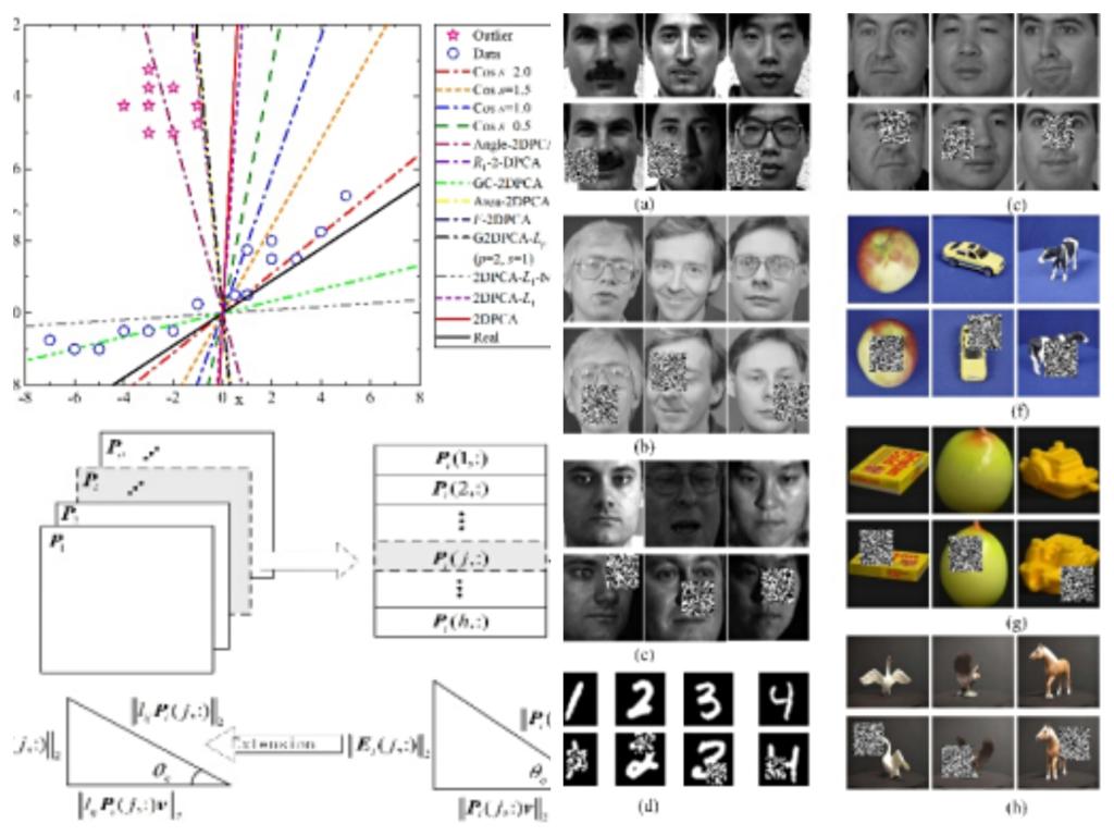 魯棒低維表征是基于統計學思想,利用不同范數的數據度量方式進行廣義數據表征和數據壓縮,在表面故障診斷、模式識別、目標識別等領域具有比較廣泛應用,尤其在當前疫情防控常態化條件下應用于人臉識別更具針對性。作者提出余弦目標優化模型,采用具有可調冪的向量2范數作為距離度量,以最大化權重投影,更有助于抑制隱藏在數據之間的不確定性和變異性。作者進一步開發求解Cosine 2DPCA的貪婪迭代算法,并從理論上證明解的收斂性和相關性。這一工作表明,提出的Cosine 2DPCA方法在重構性能、相關性能、復雜度性能及分類性能等方面均有顯著改進,其性能優于現有大多數數據表征方法,為解決復雜環境下的魯棒低維表征提供了新途徑。