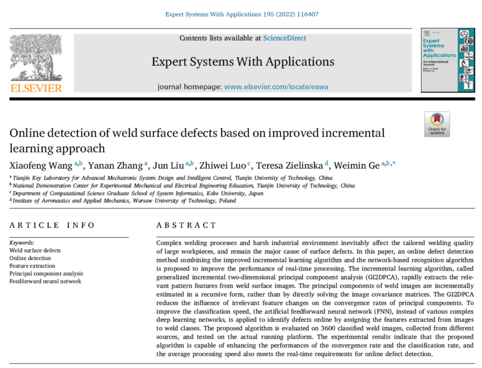 此前,該成果得到國家重點研發計劃和天津市科技計劃智能制造重大專項支持,成功應用于國家重點研發計劃中的焊縫表面缺陷識別研究。2022年3月,其相關應用成果以“Online detection of weld surface defects based on improved incremental learning approach”為題發表在EXPERT SYSTEMS WITH APPLICATIONS(ESWA)期刊上。