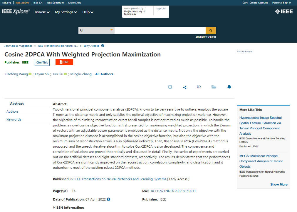 日前,機械工程學院科研團隊在IEEE Transactions on Neural Networks and Learning Systems(TNNLS)期刊上發表題為“Cosine 2DPCA with Weighted Projection Maximization”的研究成果,創新提出基于向量2范數度量的投影距離和重構誤差雙目標優化策略。TNNLS是在美國電氣和電子工程師協會(IEEE)人工智能及機器學習領域國際頂級期刊,旨在出版神經網絡和學習系統方面的理論、設計和應用的技術文章,期刊影響因子為10.451。該成果以天津理工大學作為第一完成單位和第一通訊單位發表,第一作者為王肖鋒副教授,第二作者為碩士研究生石樂巖,第一通訊作者為劉軍教授。