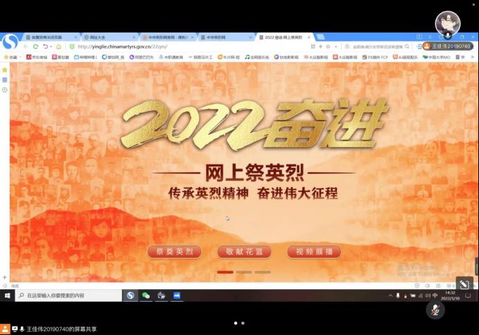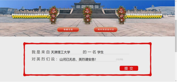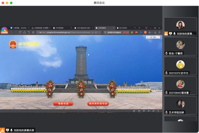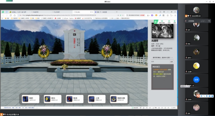 天理青年齊聚網絡,默然肅立、沉痛哀悼烈士英魂。天津市青馬學員、語言文化學院2019級本科生、校學生會主席團成員劉欣怡,校青馬學員、機械工程學院2020級研究生劉昊昆,校青馬學員、管理學院2019級本科生邸文睿分別帶領天理青年“云端敬獻花籃”緬懷革命先烈寄托哀思。