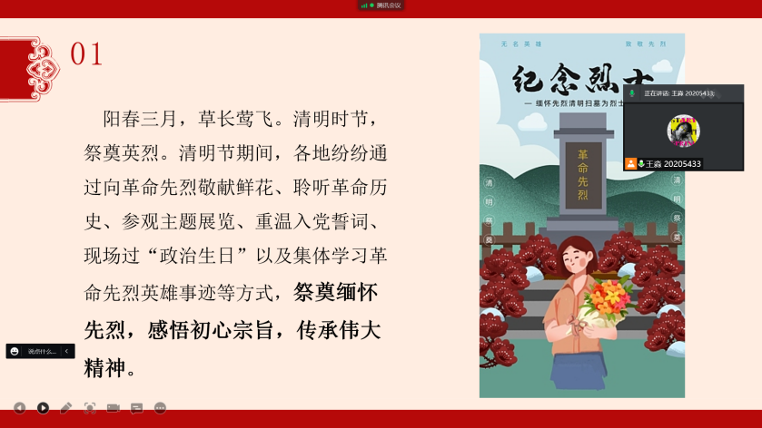 材料科學與工程學院各基層團支部、學生組織創新形式,組織開展“清明祭英烈”系列線上活動?;顒又?,同學們通過在線上共同觀看黨史劇《覺醒》《十月圍城》《狙擊手》等紅色影片、聆聽與誦讀烈士家書、分享英雄感人事跡、繪制手抄報、制作紙菊花等形式緬懷革命英烈,同時,引導青年學生知史愛黨、知史愛國,在學思踐悟中努力成長為堪當民族復興大任的時代新人。