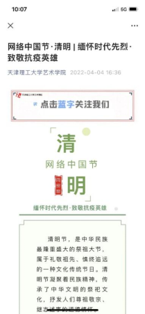 藝術學院積極倡導同學們進行網上祭掃,通過“中華英烈網”的“祭奠英烈”板塊為英烈“獻花”、“敬獻花圈”等;在微信公眾號推出推文《緬懷時代先烈·致敬抗疫英雄》,并設置H5鏈接,大家紛紛留言表達對英烈的崇敬和緬懷。另外,還通過觀看紅色影片、手寫觀影體會等形式,引導同學們繼承革命先烈遺志、傳承先烈革命精神,牢記時代使命,樹立報效祖國的遠大志向。