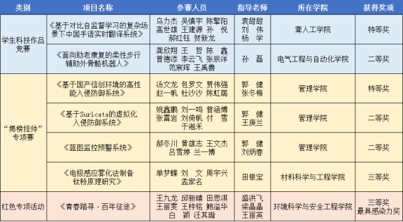 此外,學(xué)校還獲得全國(guó)二等獎(jiǎng)1項(xiàng);“揭榜掛帥”專項(xiàng)賽特等獎(jiǎng)1項(xiàng)、二等獎(jiǎng)2項(xiàng)、三等獎(jiǎng)1項(xiàng);紅色專項(xiàng)活動(dòng)三等獎(jiǎng)1項(xiàng)和“最具感染力獎(jiǎng)”,實(shí)現(xiàn)了我校在“挑戰(zhàn)杯”全國(guó)大賽多個(gè)類別競(jìng)賽中獲獎(jiǎng)數(shù)量和等級(jí)的新突破。