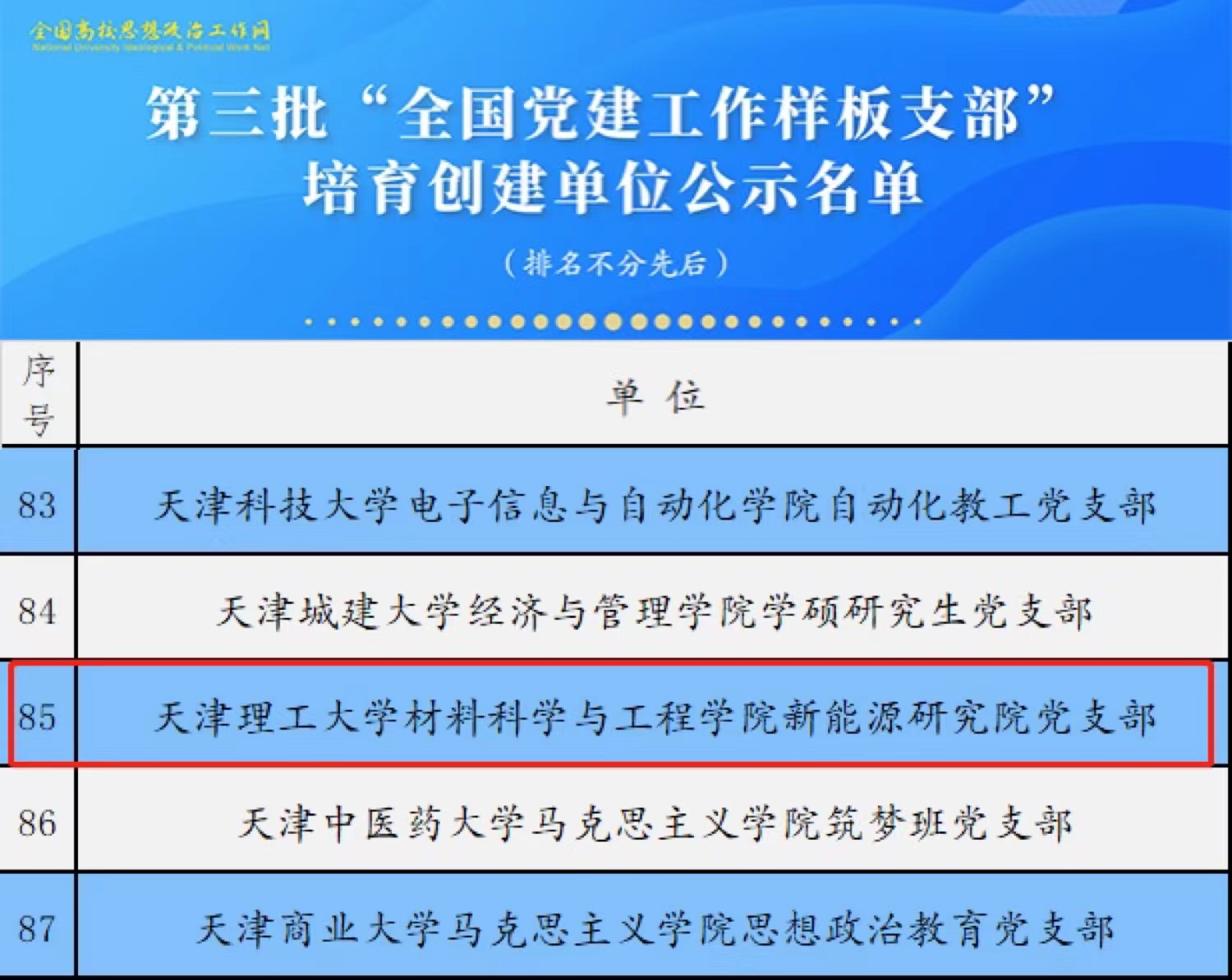 日前,教育部思想政治工作司發(fā)布第三批全國(guó)黨建工作示范高校、標(biāo)桿院系、樣板支部培育創(chuàng)建單位名單,我校材料科學(xué)與工程學(xué)院新能源研究院黨支部成功入選《第三批“全國(guó)黨建工作樣板支部”培育創(chuàng)建單位名單》。