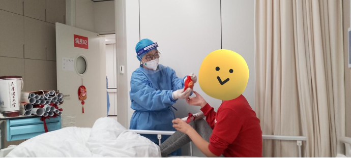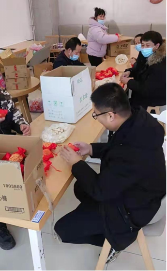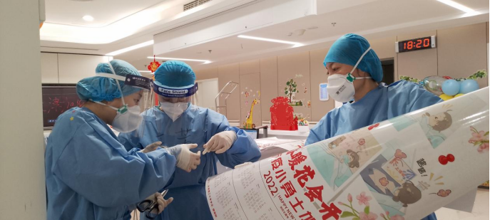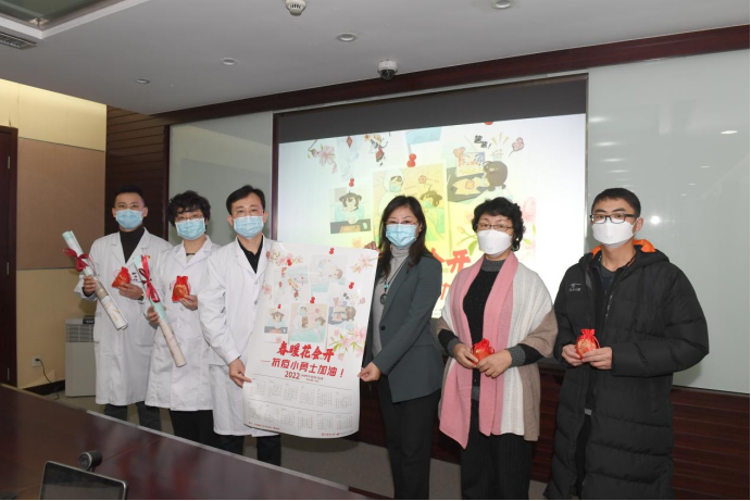 漫畫在被媒體報道后,引發眾多轉載、點贊。一中心醫院的相關負責人關注到網上的相關報道后非常感動,聯系學校,代表正在醫院進行康復治療和健康監測的孩子們表達感謝。1月25日恰逢農歷小年,學校根據學生設計的漫畫,于1月24日連夜趕制出百余份“春暖花會開,抗疫小勇士加油!”主題的2022年年歷,作為禮物送給這些孩子們。學校后勤處得知這個消息后,也送來了農歷小年寓意迎祥納福的糖瓜,用福袋包裝好作為禮物一并送給這些孩子們。1月25日下午,學校將這些年歷以及用福袋包好的糖瓜,送到一中心醫院并通過醫護人員轉送給正在醫院進行康復治療和健康監測的孩子們手中。