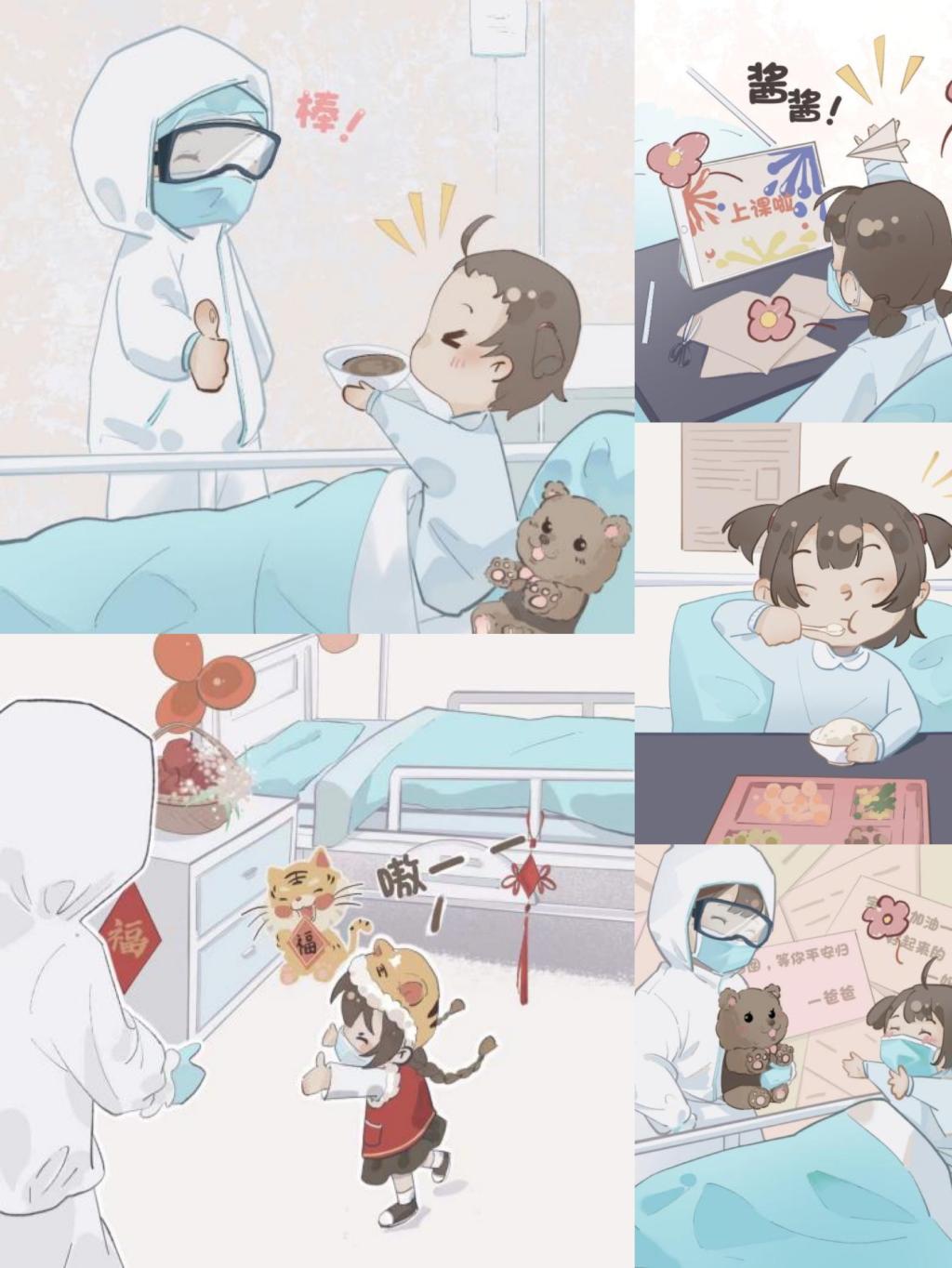 整個社會都在關注著這群孩子們的治療狀態,為他們在這么小的年紀就同父母分離進行隔離治療而憂心牽掛。出乎意料的是,疫情面前,孩子們表現得堅強懂事,積極配合。近日,我市本輪本土疫情中確診的兒童患者陸續出院后,被送往市第一中心醫院水西院區,繼續接受康復治療和健康監測。藝術學院2020級視覺傳達設計專業的學生楊佳悅,便創作出一組戰“疫”主題的漫畫,描繪孩子們在醫院治療、生活的溫馨場景,為這些堅強樂觀的孩子們點贊、加油。