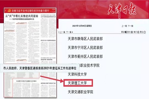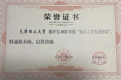近日,天津市人民政府、天津警備區(qū)通報表揚2021年度征兵工作先進單位,我校榮獲天津市2021年度“征兵工作先進單位”榮譽稱號。