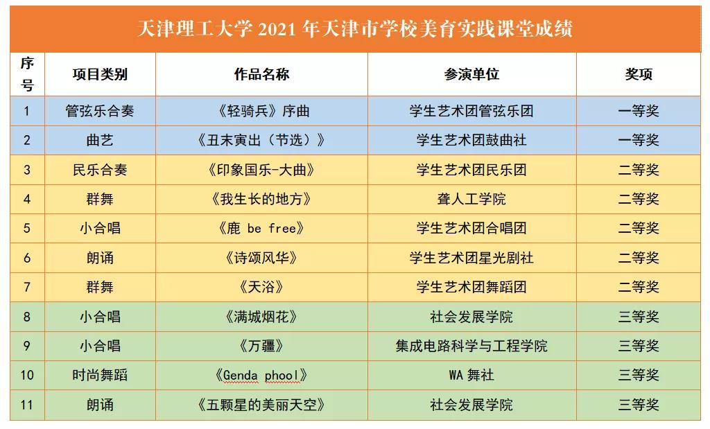 近日,天津市教委主辦的2021年天津市學校美育實踐課堂落下帷幕。我校學生藝術團、相關學院共選送管弦樂合奏、民族樂器合奏、曲藝、小合唱、朗誦、群舞等11部作品,獲評一等獎2項、二等獎5項、三等獎4項,為歷年參賽獲獎數量之冠。