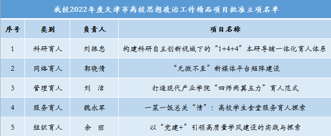 近日,依據《市委教育工委市教委關于開展天津市高校思想政治工作精品項目培育建設的通知》,經學校推薦、專家組評審,我校在科研育人、網絡育人、管理育人、服務育人及組織育人類別中的5個項目入選2022年度天津市高校思想政治工作精品項目批準立項名單。