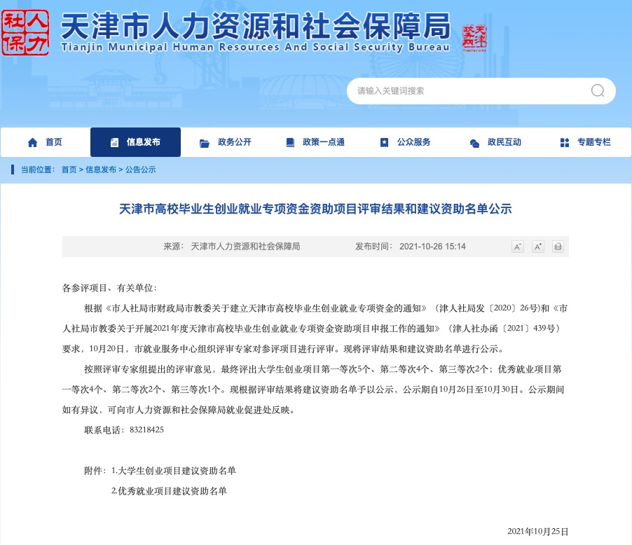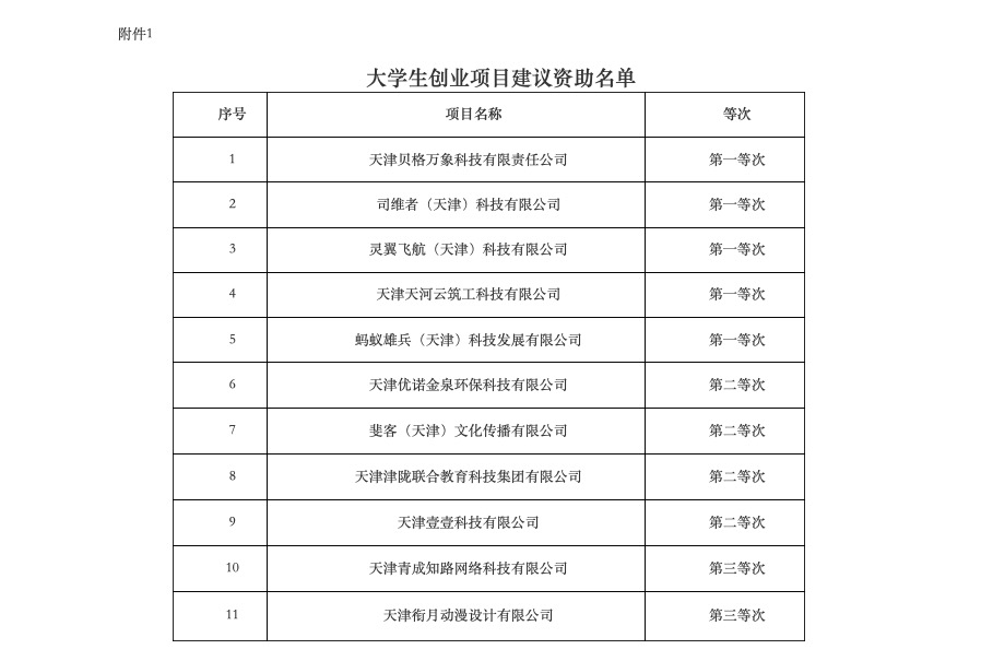 近日,天津市人力資源和社會保障局發(fā)布2021年度天津市高校畢業(yè)生創(chuàng)業(yè)就業(yè)專項資金資助項目建議資助公示名單,我校大學(xué)生創(chuàng)業(yè)項目“天津天河云筑工科技有限公司”被評為第一等次建議資助項目。