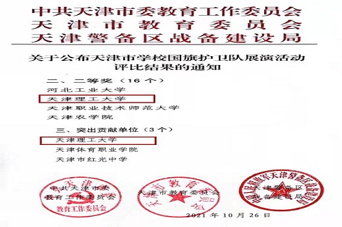 近日獲悉,在市委教育工委、市教委、天津警備區戰備建設局主辦,南開區人民武裝部與我校共同承辦的“愛黨報國鑄軍魂 立德樹人展風采”慶祝中國共產黨成立100周年天津市國旗護衛隊展演活動中,我校榮獲二等獎及突出貢獻單位獎。
