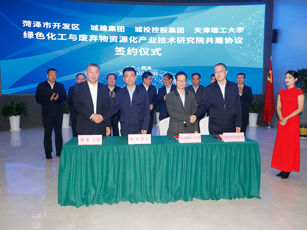 簽約儀式上,副校長陳勝勇與菏澤市政府副秘書長劉培廷共同簽署校地合作戰(zhàn)略協(xié)議,與菏澤經(jīng)濟(jì)開發(fā)區(qū)黨工委委員、黨群工作部主任孔魯民,菏澤城建集團(tuán)黨委書記、董事長晉衛(wèi)兵,菏澤城投控股集團(tuán)黨委書記、董事長韓冬共同簽署天津理工大學(xué)綠色化工與廢棄物資源化產(chǎn)業(yè)技術(shù)研究院共建協(xié)議。劉東志與聶元科共同為天津理工大學(xué)(菏澤)產(chǎn)業(yè)技術(shù)研究院揭牌。