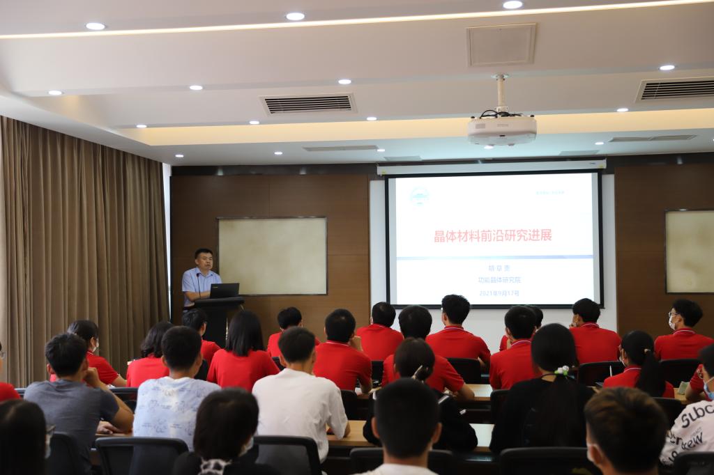 儀式結(jié)束后,功能晶體研究院院長胡章貴以《晶體材料前沿研究進展》為題為同學們講授專業(yè)第一課。