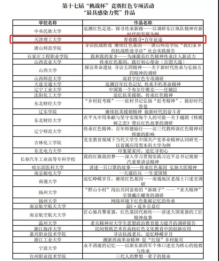 作品《青春踏尋·百年征途》聚焦紅色英雄人物,致力紅色文化傳播,調研百年精神譜系,走訪紅色教育基地,形成十大系列成果,引起了學生及社會的廣泛關注,曾榮獲第十七屆“挑戰杯”全國大學生課外學術科技作品競賽紅色專項活動全國三等獎。