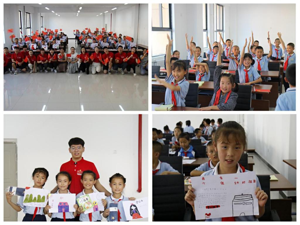 走進校園講思政。實踐團成員走進正寧縣第一中學,面向高一2個班級共計80余名學生講授《百年風華恰自來》和《我走過百年之路》黨史微團課;為學生開展團體輔導小課堂,耐心解答學業困惑,引導學生們科學認識自己、明晰奮斗目標、刻苦勤奮學習、感恩回饋家鄉;和學生們一起借助顏料、畫布等,通過對樣圖重新設計和放大,完成了一幅具有“請黨放心,強國有我”特殊意義的巨畫,用藝術點亮青春、助力鄉村振興,用美好與幸福描繪出新時代鄉村振興宏圖;最后,大家來到操場合唱《我和我的祖國》,嘹亮的歌聲、舞動的紅旗,寄托了大家對中國共產黨、對祖國深深的熱愛。成員們還走進正寧縣北辰小學,為60余名小學生帶來了一趟充滿趣味、描繪理想的思政課,通過互動游戲、彩色繪圖、童聲合唱表達對黨、對祖國和家鄉的熱愛。此外,成員們建立留守兒童暑期課業輔導線上小課堂,暑假期間定期為孩子們輔導功課,用實際行動為鄉村振興辦實事兒。