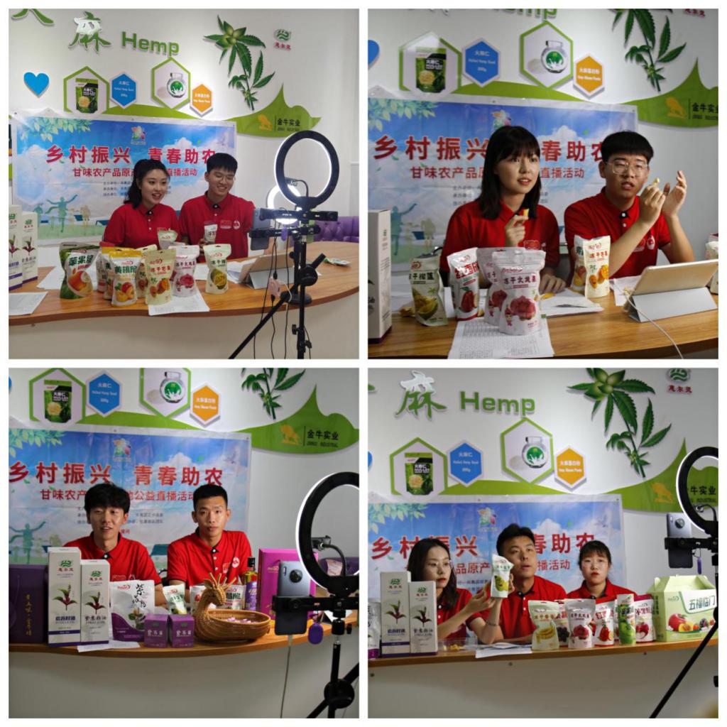 化身主播辦實事兒。實踐團走訪正寧香包基地——春繡閣香包刺繡有限公司,了解正寧縣香包產業發展情況及在鄉村振興中發揮的重要作用,并與正寧縣金牛實業有限責任公司共同發起“天理青年帶甘味 鄉村振興在路上”線上直播。天理學子紛紛走進直播間,化身主播帶貨“小能手”,從企業介紹、品牌講解、產品展示等方面全面展示了蘋果脆、紫蘇油、凍干草莓等特色產品,用實際行動助力鄉村振興,為當地居民和企業辦實事兒。