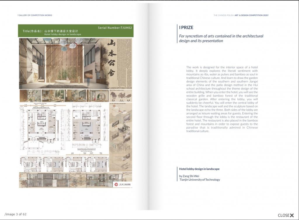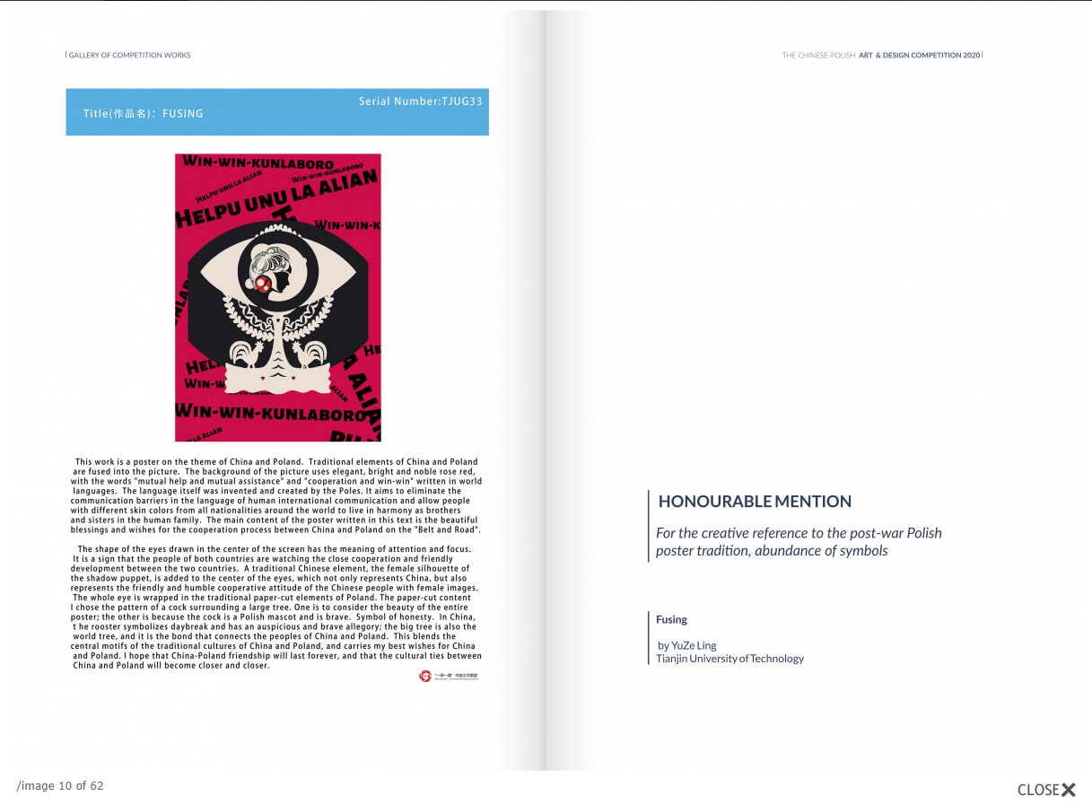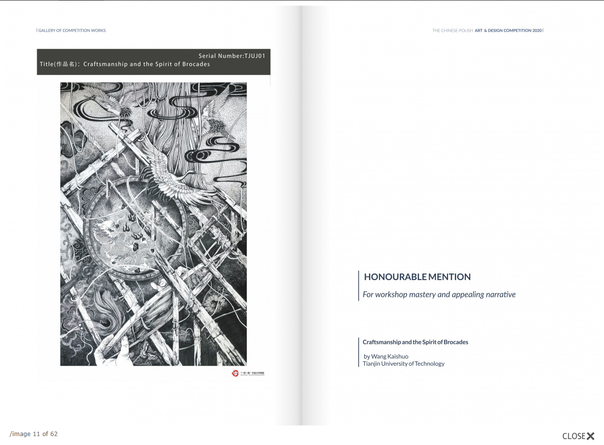 據悉,本次大賽以“一帶一路·藝心相通——藝術設計中的思維與感覺”為主題,依托聯盟友好交流平臺,通過藝術創作類作品交流形式,促進中波兩國高校學生間對話,推動兩國學術合作伙伴關系。2021年7月5日,比賽頒獎典禮通過網絡進行了直播,參賽作品整體呈現了較高的藝術水準。最終評審團一致決定授予一等獎1項、二等獎1項、三等獎2項和榮譽獎7項。