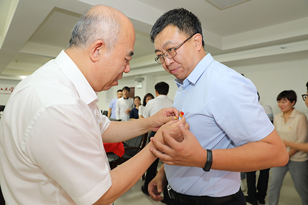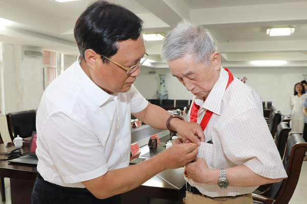 會后,校領導為參會師生佩戴了中國共產黨成立100周年紀念徽章。
