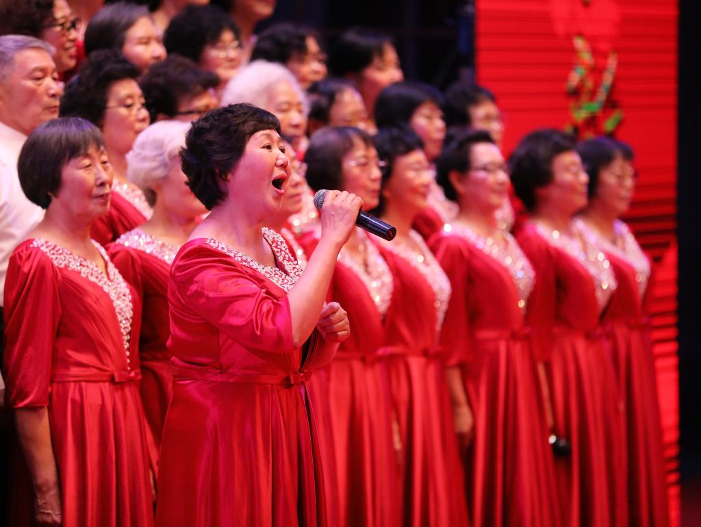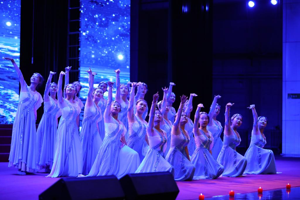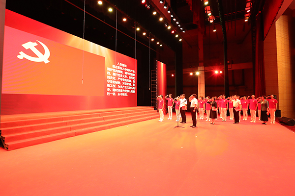 校黨委書記劉東志帶領全場黨員師生重溫入黨誓詞,表達天理師生不忘初心、牢記使命、永遠前進的信心和決心。錚錚誓言將整場展演推向高潮。展演在全場師生飽含深情的合唱《沒有共產黨就沒有新中國》中圓滿結束。